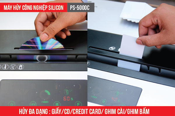 - Máy hủy tài liệu Silicon PS-5000C được thiết kế linh hoạt, tính thẩm mỹ cao, độ ồn thấp, khi sử dụng máy không ảnh hưởng đến năng suất làm việc của con người.