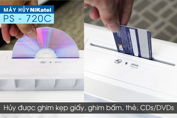 – Máy hủy tài liệu NiKatei PS-720C có chức năng hủy đĩa CD, ghim bấm và thẻ tín dụng.