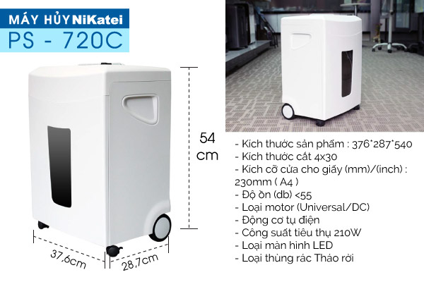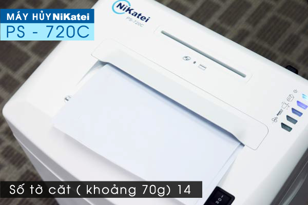 – Máy hủy tài liệu NiKatei PS-720C có công suất số tờ căt ( khoảng 70g) 14, thùng chứa giấy vụn 22,5 lít nên phù hợp sử dụng cho văn phòng vừa và nhỏ, các công ty, cơ quan, ngân hàng.