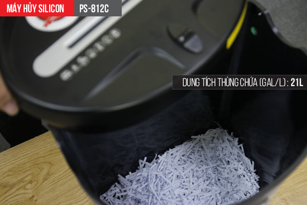 Máy hủy tài liệu Silicon PS-812C có công suất Hủy 1 lần 8 tờ A4/70g, thùng chứa giấy vụn 21 lít nên phù hợp sử dụng cho văn phòng vừa và nhỏ, các công ty, cơ quan, ngân hàng.