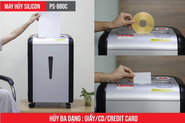 – Máy hủy tài liệu Silicon PS-880C được thiết kế đa năng, với nhiều chức năng. Ngoài công dụng chính dùng để hủy tài liệu hủy giấy thì máy có thêm chức năng hủy thẻ tín dung, hủy đĩa CD, DVD rất tiện dụng.