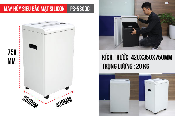 - Máy hủy tài liệu Silicon PS-5300C được thiết kế linh hoạt, tính thẩm mỹ cao, độ ồn thấp, khi sử dụng máy không ảnh hưởng đến năng suất làm việc của con người.